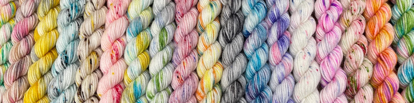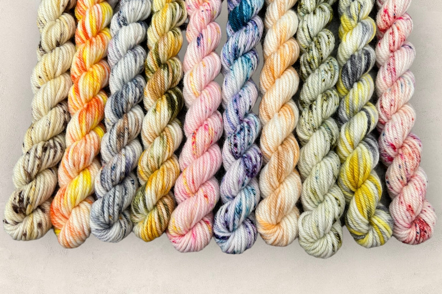 Our latest mystery mini skeins feature 24 × 10g 4-ply sock yarns in a surprise mix of colours. Each set is carefully curated and dyed in small batches. Discover what’s inside below.