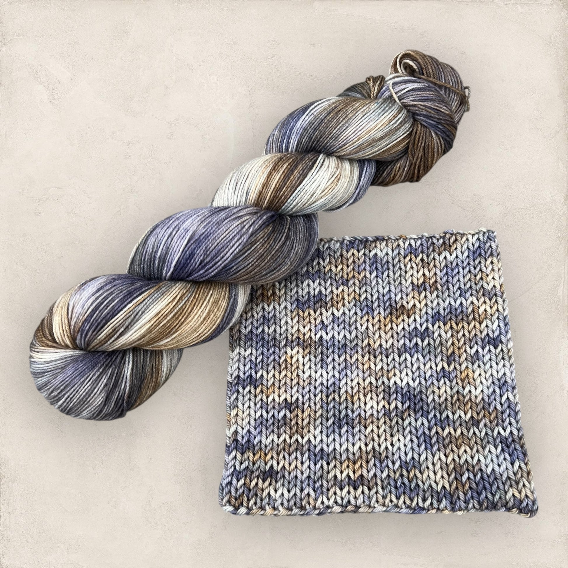 Frosted Heather is a soft and elegant hand dyed yarn in gentle tones of tan, grey, and lilac with hints of blue, it’s perfect for socks, shawls, and lightweight accessories. The subtle colour blend creates a calm, misty effect reminiscent of heather-covered hills touched by morning frost.